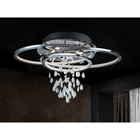 Mennyezeti lámpa fémből, króm kivitelben. Fehér kristályok tiszta szélekkel. Aszimmetrikus oválisok fehér metakrilát diffúzorokkal, belül LED lámpával...