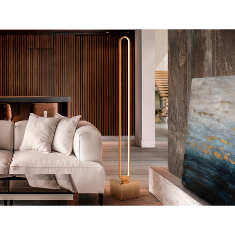 1 lámpás LED állólámpa, szálcsiszolt alumíniumból és matt festett fém talpból, rózsaszín arany kivitelben. Opál szilikon diffúzor. 32,4 W LED, 2.250 lm, 3.000 K...