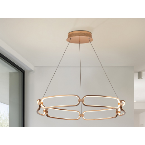Nagy LED lámpa, szálcsiszolt alumíniumból, rózsaszín arany kivitelben. Opál szilikon diffúzorok. Állítható hosszúságú. 65W LED, 5850 lm, 3000 K. Dimmelhető. Távirányító mellékelve...