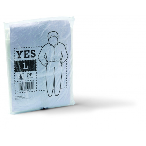 Egyszer használatos overál polipropilén filcből, kapucnival, cipzárral, kéz-, láb- és derékgumival. 1-es kategóriájú, védelmet nyújt minimális veszélyekkel szemben. Nem egyéni védőeszköz!