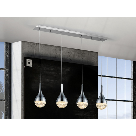 LED lámpa 4 lámpából, fémből, króm kivitelben. Tömör üvegből készült csepp alakú ernyők dekoratív buborékokkal. Állítható hosszúságú. 4x5W LED. 1600 lm. 3000 K...
