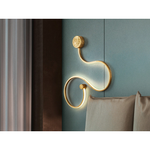 Fali lámpa acélból és alumíniumból. ARANYLEVELES kivitel. Opál szilikon diffúzor. Az elem lehetővé teszi a kar jobbra vagy balra fordítását. LED világítás 19,5 W. 900 lm. 3000 K...