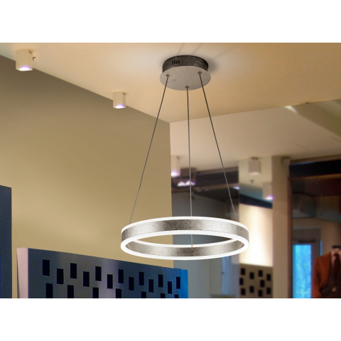 Fémből és alumíniumból készült lámpa, EZÜST LEVÉVEL. Gyűrű opál akril diffúzorral. Állítható hosszúság. 55W LED. 3000K. 3300 lm..