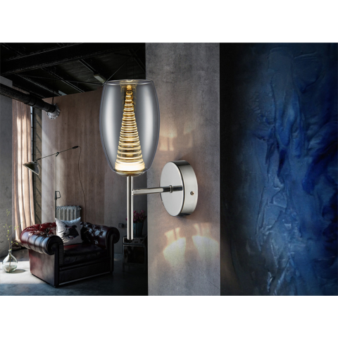 Fali lámpa 1 LED lámpából, fémből, króm kivitelben. Dupla ernyő, külső csillogó üvegből, belül pedig átlátszó polikarbonát rétegelt kúp alakú. 5W LED. 450 lm 3.000 K...
