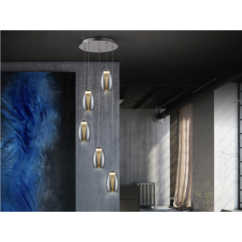 Lámpa 5 LED lámpából, fémből, króm kivitelben. Dupla ernyő, külseje csillogó üvegbúra, belül pedig átlátszó polikarbonát rétegelt kúp alakú. Állítható hossza. 5x5W LED. 2.250 lm 3.000 K...