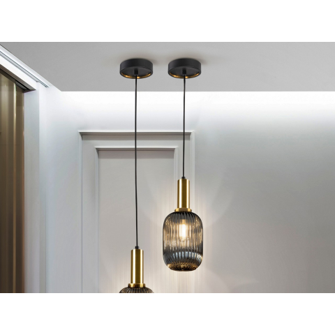 Lámpa fémből, matt fekete színben, szatén sárgaréz részletekkel. Átlátszó öntött üvegbúra füstszürke tükrös kivitelben. Állítható hossza...