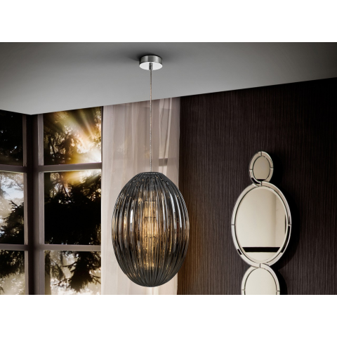 Lámpa 1 lámpából, fémből, króm kivitelben. Nagy üvegernyő csillogó füstölt szürke tónusban. Állítható hosszúság...