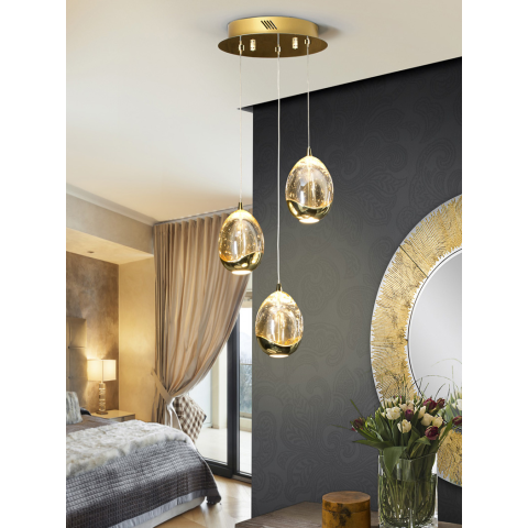 3 LED-es lámpa, fémből, arany színű. Csepp alakú üvegernyők tömör üvegben, pezsgős tónusú, belsejében díszbuborékokkal. Állítható hosszúságú. 15W LED. 1,440 lm. 3000 K...