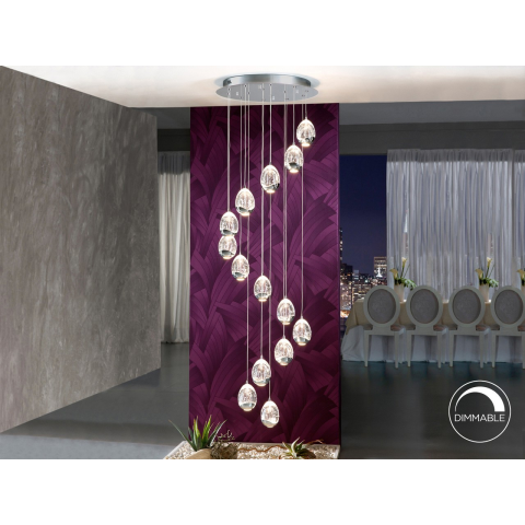 14 LED-es lámpa. Fémből készült, krómozott. Tömör üvegből készült csepp alakú ernyők dekoratív buborékokkal. Állítható hosszúságú. BLUETOOTH-AL FÉNYÉRÍTHETŐ APP-vel okostelefonhoz.70 W LED, 6720 lm, 3000 K..