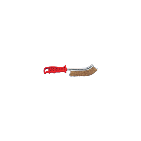 Drótkefe acél szálakból, hajlított, rövid nyéllel. Teljes hoszz: 23 cm.