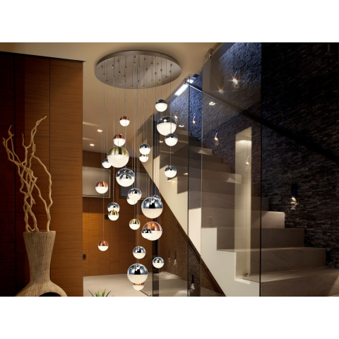 NAGY MÉRETE 27 LED-es lámpa. Krómozott fém. Polikarbonát ,fém bevonattal, rézzel és szatén sárgarézzel és krómmal. BLUETOOTH által DIMMELHETŐ, APP okostelefonhoz. 147,6 W-os LED. 3000K. 10330 lm...