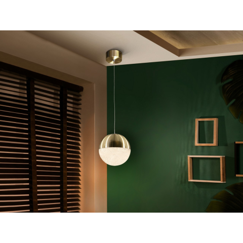 1 fényes LED lámpa, fémből, szatén sárgaréz kivitelben. Polikarbonát gömb alakú belső textúrával. Állítható hosszúság. 9,6 W-os LED. 3000 K. 672 lm...