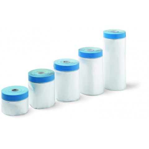 Kihajtható, vékony takarófólia tekercs, papír ragasztószalaggal, beltéri használatra.
