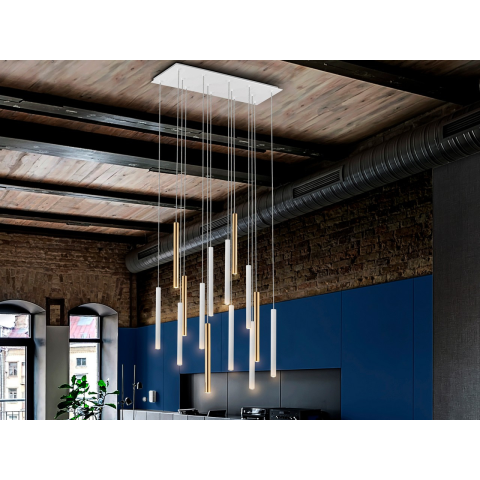 14 fényes LED lámpa. Fémből készült, fényes arany és matt fehér kivitelben. Opál akril diffúzor. 70W LED, 6300 lm, 3000 K. Dimmelhető. Maximális magasság 3 méter...