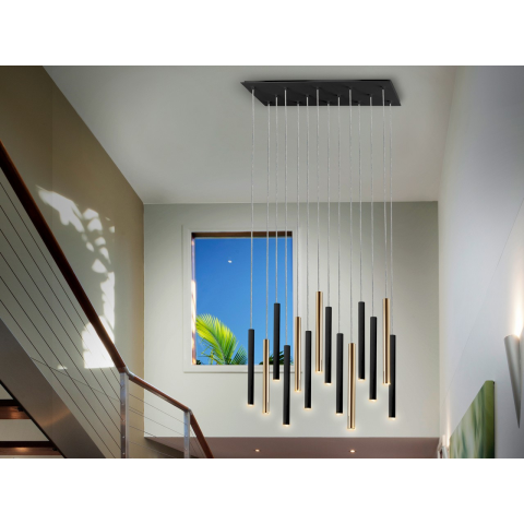 14 LED-es lámpa. Fémből készült, arany és matt fekete színben. Opál akril diffúzor. 70W LED, 6300 lm, 3000 K. Maximális magasság 3 méter. Dimmelhető...