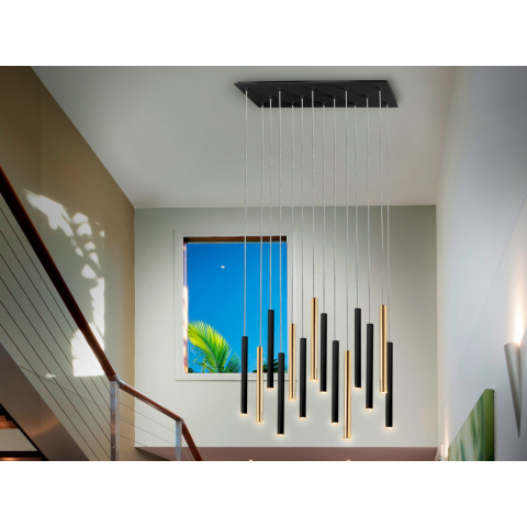 14 LED-es lámpa. Fémből készült, arany és matt fekete színben. Opál akril diffúzor. 70W LED, 6300 lm, 3000 K. Dimmelhető. Maximális magasság 3 méter. Távirányító mellékelve...