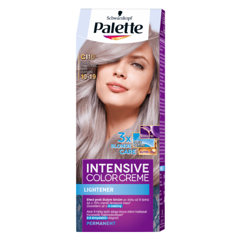 Palette Intensive Color Creme 10-19 hűvös ezüstszőke árnyalatú hajfesték Blonde Care Plex technológiával, mely az intenzív ápolás mellett hosszantartó szőke színeredményt nyújt. Segíti a hajszálak belső szerkezetének védelmét a kevésbé töred