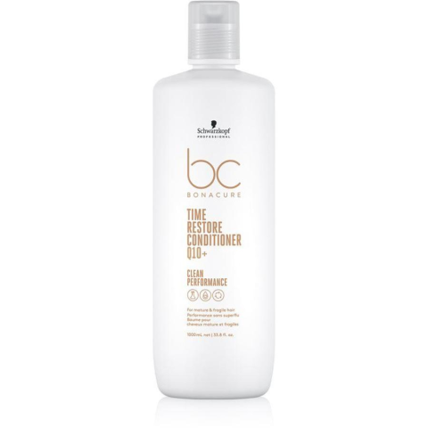 Schwarzkopf Bonacure Clean Preformance Time Restore Q10 balzsam, 1 l- Biztosítja az érett haj védelmét az öregedés látható jeleivel szemben- Q10 koenzimmel gazdagítva táplálja a hajat, vitalitást, fényt ad neki és selymes tapintásúvá teszi