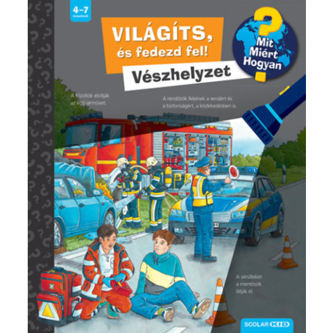A Ravensburger népszerű Mit? Miért? Hogyan? gyermekkönyvsorozatának "fóliaoldalakkal" különlegessé tett kötetét lapozgatva az óvodások és a kisiskolások megtudhatják, mit jelent a vészhelyzet, milyen feladataik vannak az életmentőknek, miért van szükségünk tűzoltókra, ki segít a betegeken és a sérülteken, és miben tudnak segíteni a gyerekek.