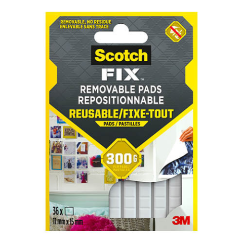 A Scotch-Fix™ eltávolítható tapadópárnák illeszkedő gittpárnák és nem hagynak maradványokat, ideálisak könnyűszerkezetek festett vagy tapéta felületekre történő Pl. papír, fénykép, plakát, kártya és egyebek felszereléséhez. Ezek az akár 300g teherbírású e