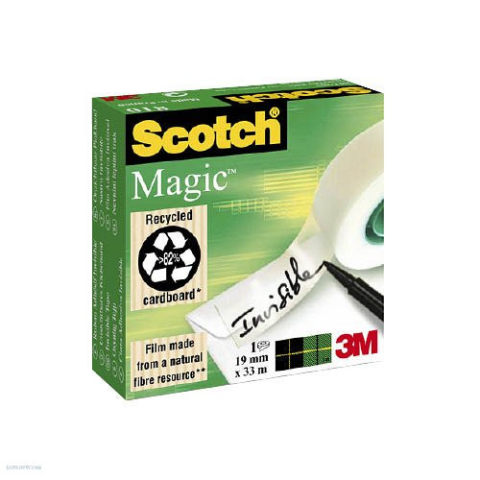 A Scotch® Magic™ matt felülete írható, papírra ragasztva láthatatlan. Fénymásoláskor sem látszik a másolaton. Könnyen téphető, irodai papírokról nyom nélkül eltávolítható, nem öregszik és nem sárgul. Dobozos, kézi adagolós és utántöltő kiszerelésben.