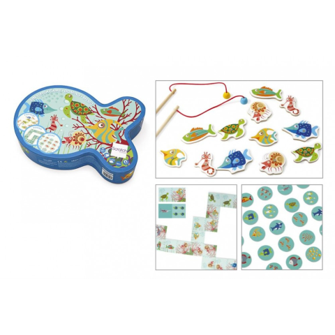 Három játékot is lehet ezzel a játékszettel játszani: dominó, memória, mágneses horgászat.A doboz mérete: 28,5*19*6,5 cm