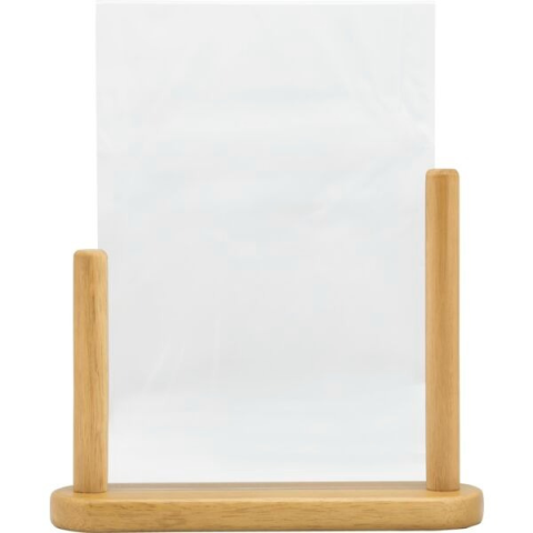 Securit akril asztali állvány bükkfa talppal, A4-es méretben. A menütartó időjárásálló, kétoldalas és könnyen tisztítható. A menü egyszerűen kicserélhető vagy frissíthető.