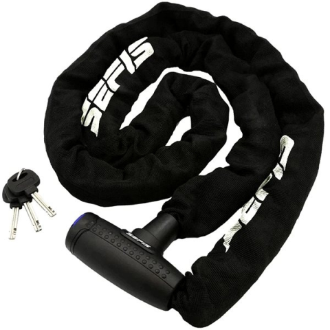 Lánczár - záródugóval a nedvesség és az átjutás elleni védelem érdekében, rozsdamentes acélból készült, 200 cm hosszú, 9,5 mm vastagságú, nagy láncszemekkel ellátott lánc, a kulcsok és az erőszakos belépési kísérletek ellenálló tárcsafedéllel, szilárd kapszula műszálból, Csomag tartalma: zár lánccal, 3 kulccsal A robusztus SEFIS motorkerékpár zár edzett acél láncszemekkel rendelkezikA SEFIS láncos motorzár 200 cm hosszú, így rendkívül könnyen fel