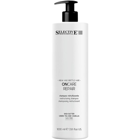 Sampon nők számára - hagyományos sampon, vékony szálú és sérült hajra ajánlott, tápláló és erősítő hatás, szulfátmentes, természetes olaj tartalmú és proteines, 1000 ml-es kiszerelésben, professzionális kozmetikum A SELECTIVE PROFESSIONAL Repair Shampoo-t károsodott, gyenge, porózus és törékeny haj intenzív regenerálására tervezték. Formulája közvetlenül a haj szerkezetére hat, helyreállítja a természetes hidro