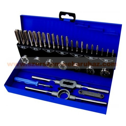 Fém dobozban szállított kézi menetfúró és menetmetsző készlet.