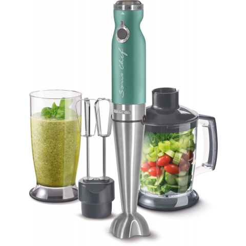 Botmixer - 1200 W teljesítmény, 20 sebességfokozat, mosogatógépben mosható tartozékok, folyamatos sebességvezérlés a gomb nyomvatartásával és turbo sebesség, vágás, habverés és mixelés, 4 penge, aprító+aprítóedény, keverőedény és habverő mellékelve, rozsdamentes acél keverőszár Az igazán hasznos Sencor merülő botmixer nem foglal sok helyet a konyhában, mégis könnyedén készíthetsz vele turmixokat, kásákat, mártásokat vagy tejszínhabot. A botmixerhez t