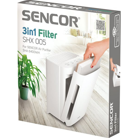 Légtisztító szűrőbetét - szén szűrő, SHA 6400WH modellhez, HEPA H13 tanúsítvány, 1 darab a csomagban Ha SENCOR SHA 6400WH légtisztítóval rendelkezel, hasznos lesz számodra ez a SENCOR SHX 005 szűrő, amely három részből áll: egy előszűrőből, amely megfogja a porszemcséket és az allergéneket, egy széns