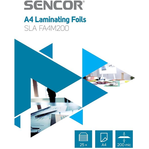 Lamináló fólia - A4, 25 darab a csomagban, dokumentumok laminálására, fólia vastagsága 100 mikron, fényes, laminálás módja meleg, dokumentum megjelenésének kiemelése A népszerű SENCOR SLA FA4M200 A4 200 mic 25 db lamináló fólia lényeges tulajdonságai A fényes felületű Sencor lamináló fólia ellenállóbbá teszi a dokumentumokat, amelyek így tartósabbak lesznek Megóvj