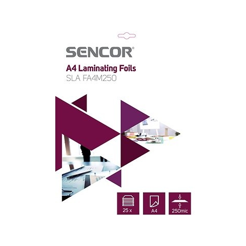 Lamináló fólia - A4, 25 darab a csomagban, dokumentumok, névjegykártyák és fényképek laminálására, fólia vastagsága 125 mikron, fényes, laminálás módja meleg, dokumentum megjelenésének kiemelése A népszerű SENCOR SLA FA4M250 A4 250mic - 25 db lamináló fólia alapvető tulajdonságai A fényes felületű Sencor lamináló fólia időtállóbbá és elnyűhetetlenné teszi a dokumentumokat Megakadályozza a gyű