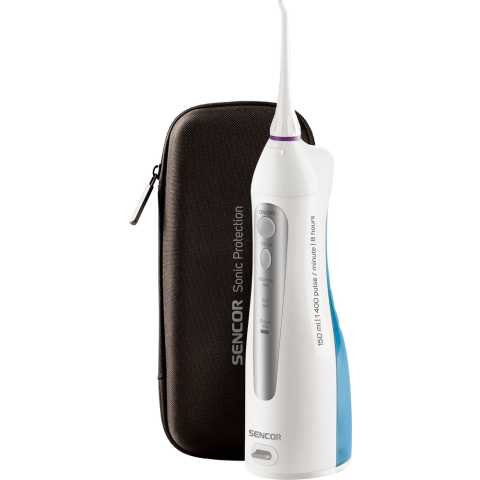 Elektromos szájzuhany - asztali, alkalmas hídra, koronára és fogszabályzóra, 3 program, 5 fúvóka a csomagban, tartály térfogata 150 ml, időzítő, egységes sugár és masszázs üzemmód, akkumulátoros tápellátás, töltési idő 8 óra, üzemidő egy töltéssel 14 nap, töltőállvány és utazási tok a csomag része SzájzuhanyA Sencor szájhigiéniai felelőse vagyok, és első osztályú szájápolást biztosítokSencor SOI 1100SLJavítok a fogak és a fogíny állapotán! S