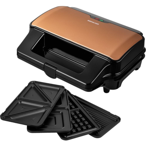 Szendvicssütő - 4 az 1-ben, cserélhető sütőlapok, 4 szendvics egyidejű készítéséhez, négyszög és háromszög sütőlapok, tapadásmentes felület, a csomagban található sütőlapok alkalmasak gofrihoz, grillezéshez, sütőlapok mérete 15,2 × 28,5 cm (Ma×Sz), túlmelegedés elleni védelem, zárható, hőszigetelt markolat a csomag része, 900 W teljesítmény, rozsdamentes acél burkolat, fekete és barna kivitel, mérete 10 × 30 × 26 cm (Ma×Sz×Mé) SencorSSM 9976GD keny