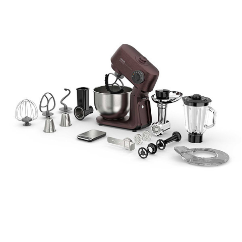 Konyhai robotgép - teljesen fém ház, bolygóműves keverés, 1500 W teljesítmény, fém belső áttétel, rozsdamentes burkolat, keverőtál anyaga rozsdamentes acél, keverőtál űrtartalma 5,5 l, 6 sebességfokozat, teljes fordulatszám szabályozás, lengőkar, funkciók habverés, keverés, dagasztás, megvilágítás, őrlés és keverés, tartozékok kolbásztöltő feltét, húsdaráló, reszelő dob, keksz készítő, ballon habverő, dagasztószár, keverő habverő (spatulás), t