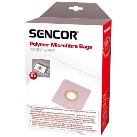 Porzsák Sencor - textil, egyszer használatos, antibakteriális, nedvességálló, űrtartalma 7,5 l, 5 porzsák a csomagban Eredeti, SENCOR SVC3001 porszívóhoz ajánlott egyszer használatos, 7,5 literes porzsák. Mikroszálas kialakításának köszönhetően akár kétszer olyan hatékony, mint a hagyományos papír porzsákok