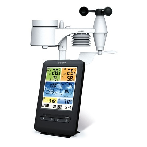 A professzionális Sencor SWS 9898 meteorológiai állomás több színű 5,4” kijelzővel rendelkezik. A standard funkciókon túl, mint a külső és belső hőmérséklet és páratartalom mérésen felül számos extra funkcióval rendelkezik. Az időjárás állomás támogatja