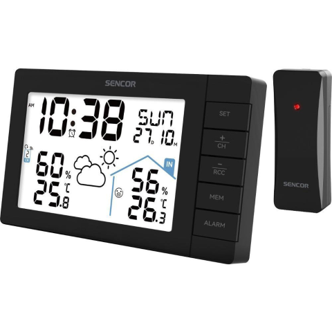 Időjárás állomás - otthoni, vezeték nélküli, rádióvezérelt csatlakozás, beltéri használatra, előrejelzéssel és valós idejű időjáráskövetéssel, ismételt ébresztés, ébresztőóra és DCF vétel, mért értékek: hőmérséklet, páratartalom, idő és dátum megjelenítése, vezeték nélküli érzékelő hatótávja 80 m, maximum 1 vezeték nélküli érzékelő csatlakoztatható, zárt rendszer, önállóan használható, elemmel működtethető, érzékelő a csomag