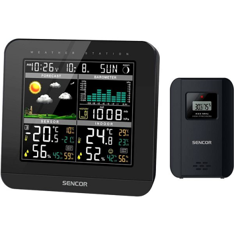 Időjárás állomás - otthoni, vezeték nélküli, rádióvezérelt csatlakozás, beltéri és kültéri használatra, előrejelzéssel és valós idejű időjáráskövetéssel, alacsony elemfeszültség jelzése, DCF vétel és max. és min. érték memória, mért értékek: légnyomás, hőmérséklet, páratartalom, idő, dátum és holdállás megjelenítése, vezeték nélküli érzékelő hatótávja 100 m, maximum 3 vezeték nélküli érzékelő csatlakoztatható, zárt rendszer, ön