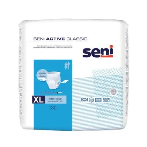 Seni Active Classic középsúlyos és súlyos inkontinenciára. A hagyományos alsóneműhöz hasonlóan kell felvenni, ideális az aktív életet élőknek és hólyagedzés esetén. - Légáteresztő - Rugalmas - Latexmentes - Szagmegkötő - Eldobható - Bőrgyógyászatilag tes