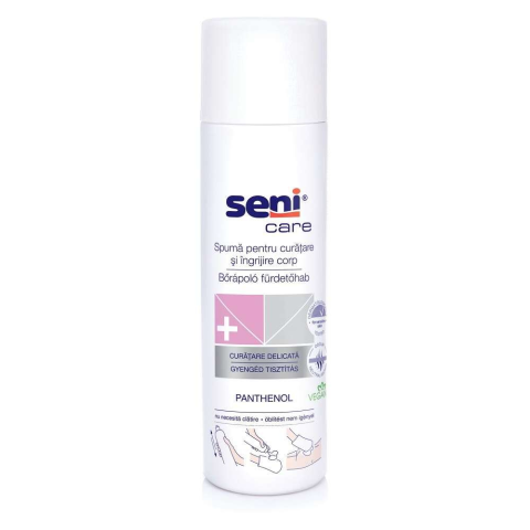 Seni Care bőrápoló fürdetőhab, gyengéden tisztít és védőréteget képez a bőrön. Tisztítja és kondicionálja a bőrt, amely különösen az inkontinens személyeknél a nedvszívó termékek cseréje miatt irritációra hajlamos. Természetes anyagokban gazdag, melye...