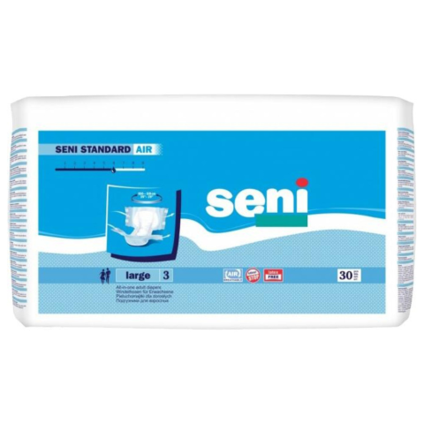 A légáteresztő Seni Standard Air inkontinencia nadrágok megbízható megoldást nyújtanak közepes vagy súlyos vizelet- és székletinkontinenciára. A termék dupla nedvszívó maggal rendelkezik, amely lehetővé teszi a folyadék gyors elvezetését a belső magba,