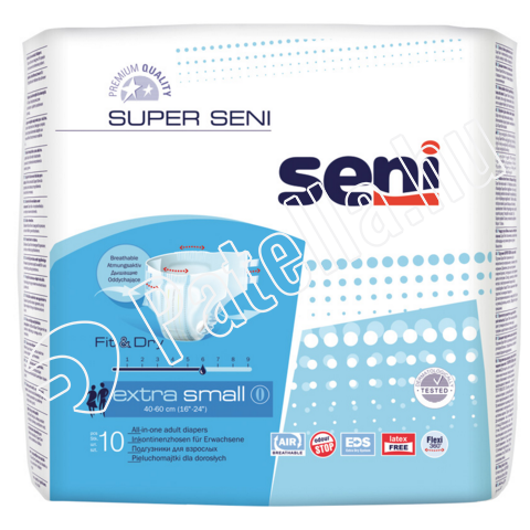Seni Super légáteresztő nadrágpelenka közepes és súlyos inkontinencia kezeléséhez. Légáteresztés hatására csökken a bőr izzadása, megelőzi a bőr irritációt és a decubitus kialakulását, illetve elősegíti a sebgyógyulás folyamatát. Csípőméret: 75-110 cm