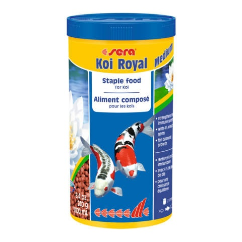 Sera Koi Royal Medium - Főtáplálék Koi pontyok részére (1000ml)A Sera Koi Royal Medium (4 mm / 0,15 hüvelyk) az alapanyag, amely gondosan feldolgozott granulátumból áll az összes Koi számára.Kiegyensúlyozott szénhidrát / fehérje aránya és 4% búzacsírainak aránya miatt nagyon könnyen emészthető és egész évben kiválóan alkalmas egészséges táplálkozásra. A Koi követelményei optimálisan teljesülnek.Az olyan értékes összetevők, mint az omega-zsírsavak és a