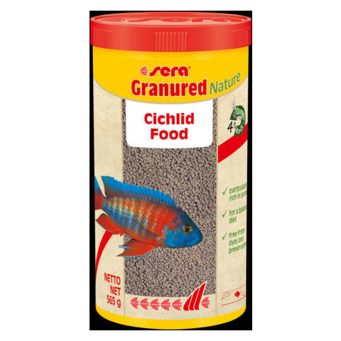 Sera Nature Granured - granulátum táplálék díszahalak számára (1000ml)A sera Granured Nature a finoman gyártott, színezékek és tartósítószerek nélküli granulátumok, elsősorban húsevő, kisebb cichlidek és mindenevők számára.Magas fehérjemennyiségükkel és értékes omega-zsírsavakban gazdag zsírjaikkal, valamint magas krillmennyiségükkel (sok ásványi anyaggal, nyomelemekkel és karotinoidokkal) a szemcsék különösen ízletesek, kiválóan emészthetőek, támog