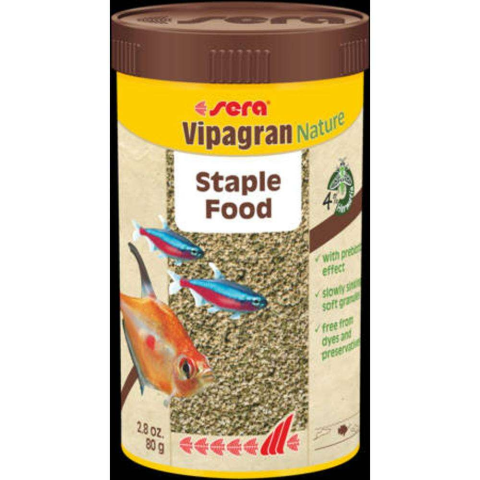 A sera Vipagran Nature a finoman előállított, színezékeket és tartósítószereket nem tartalmazó, finoman előállított lágy granulátum minden hal számára, amely a középső vízrétegekben étkezik.Kiváló minőségű fehérjeforrásként rovarlisztet tartalmaz, amely erőforrás-megtakarítást is jelent. A természetes összetevőket és prebiotikumokat tartalmazó kiegyensúlyozott összetétel lehetővé teszi a természethez különösen közeli táplálkozást, amely támog