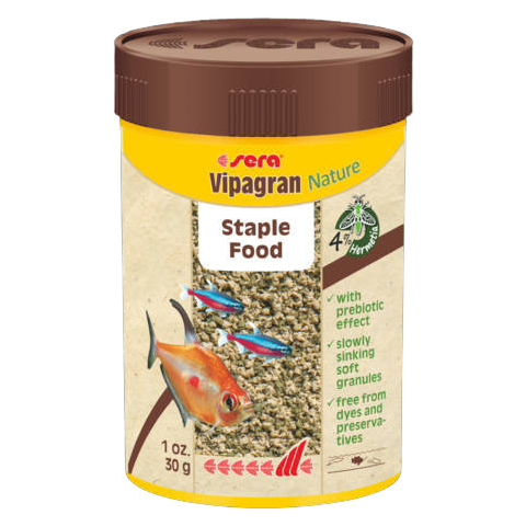 A sera Vipagran Nature a finoman előállított, színezékeket és tartósítószereket nem tartalmazó, finoman előállított lágy granulátum minden hal számára, amely a középső vízrétegekben étkezik.Kiváló minőségű fehérjeforrásként rovarlisztet tartalmaz, amely erőforrás-megtakarítást is jelent. A természetes összetevőket és prebiotikumokat tartalmazó kiegyensúlyozott összetétel lehetővé teszi a természethez különösen közeli táplálkozást, amely támog