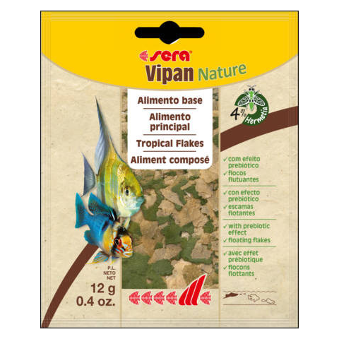 Sera Vipan - lemezes táplálék díszhalak számára (12g)Alapélelmiszer, 4% -os rovarliszttel és prebiotikus hatással.A sera Vipan Nature úszó pelyhekből álló, alapélelmiszer minden dekoratív halnak, amely a víz felszínén táplálkozik.Kiváló minőségű fehérjeforrásként rovarlisztet tartalmaz.A természetes összetevőket és prebiotikumokat tartalmazó kiegyensúlyozott összetétel lehetővé teszi a természethez nagyon közel álló étrendet, amely támogatja az egész